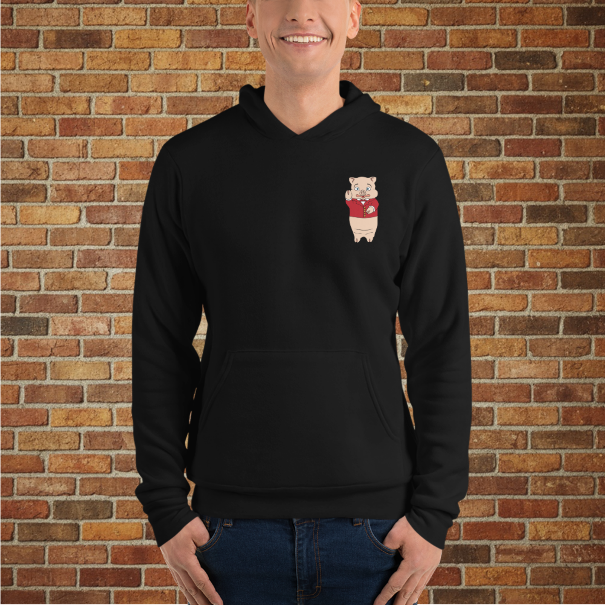Front view of Rudy’s Bar & Grill Baron Von Swine Neon Sign Hoodie worn by a model – black pullover with small Baron Von Swine pig mascot graphic on the chest, displayed against a brick wall background