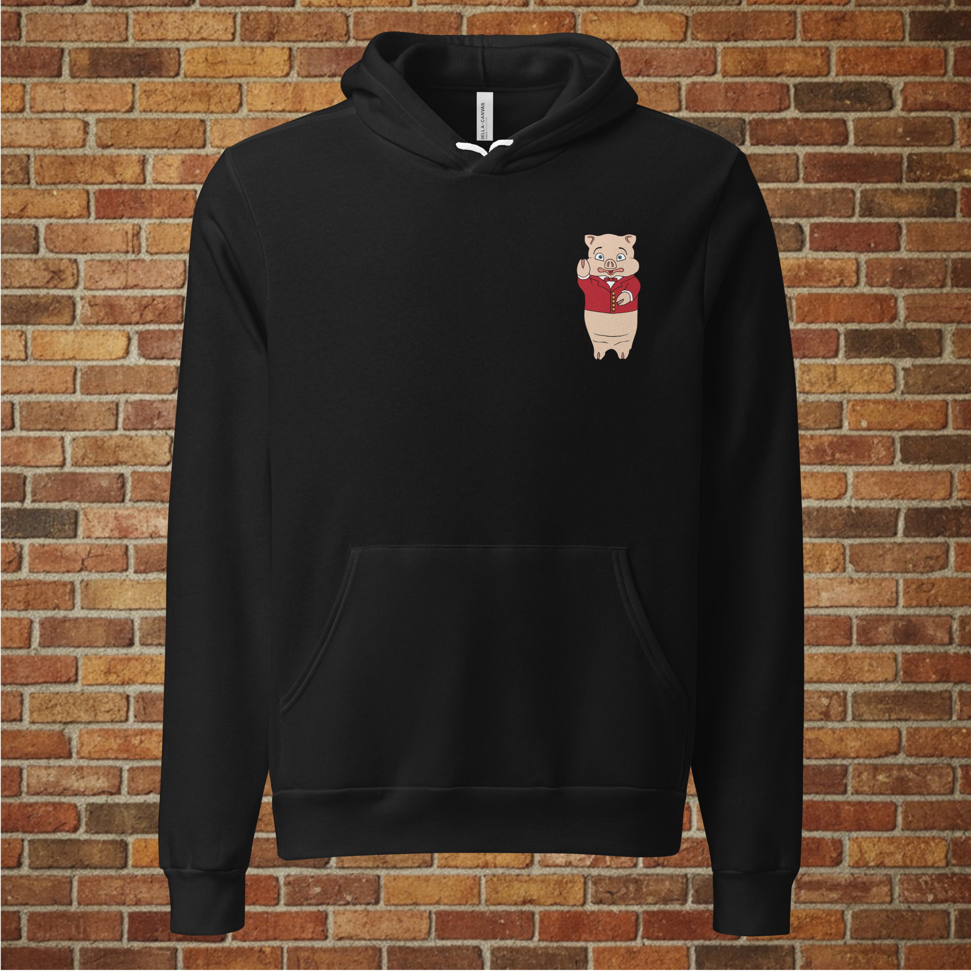 Front view of Rudy’s Bar & Grill Hell’s Baron Von Swine Neon Sign Hoodie – black pullover with small Baron Von Swine pig mascot graphic on the chest, displayed flat against a brick wall background