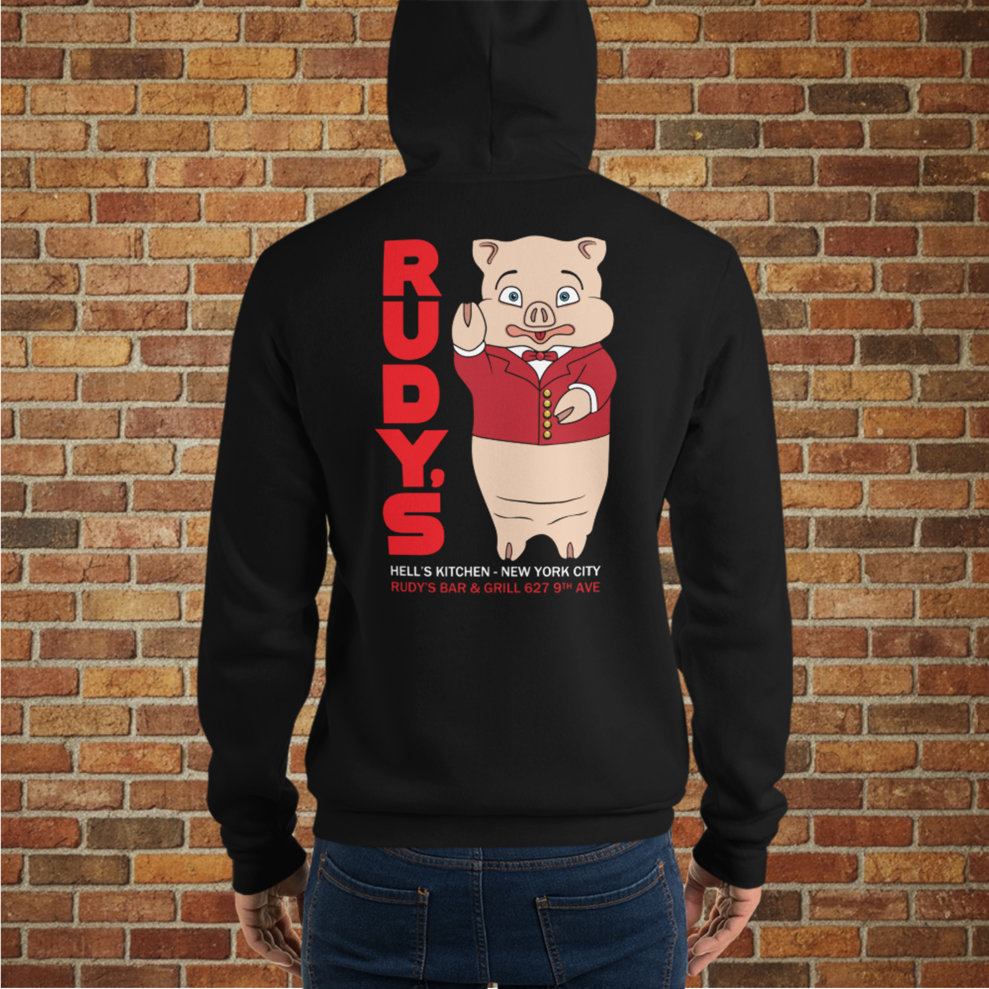 Flat lay of black hoodie showing Rudy’s Bar & Grill pig mascot and Hell’s Kitchen NYC address on back, displayed against brick wall background