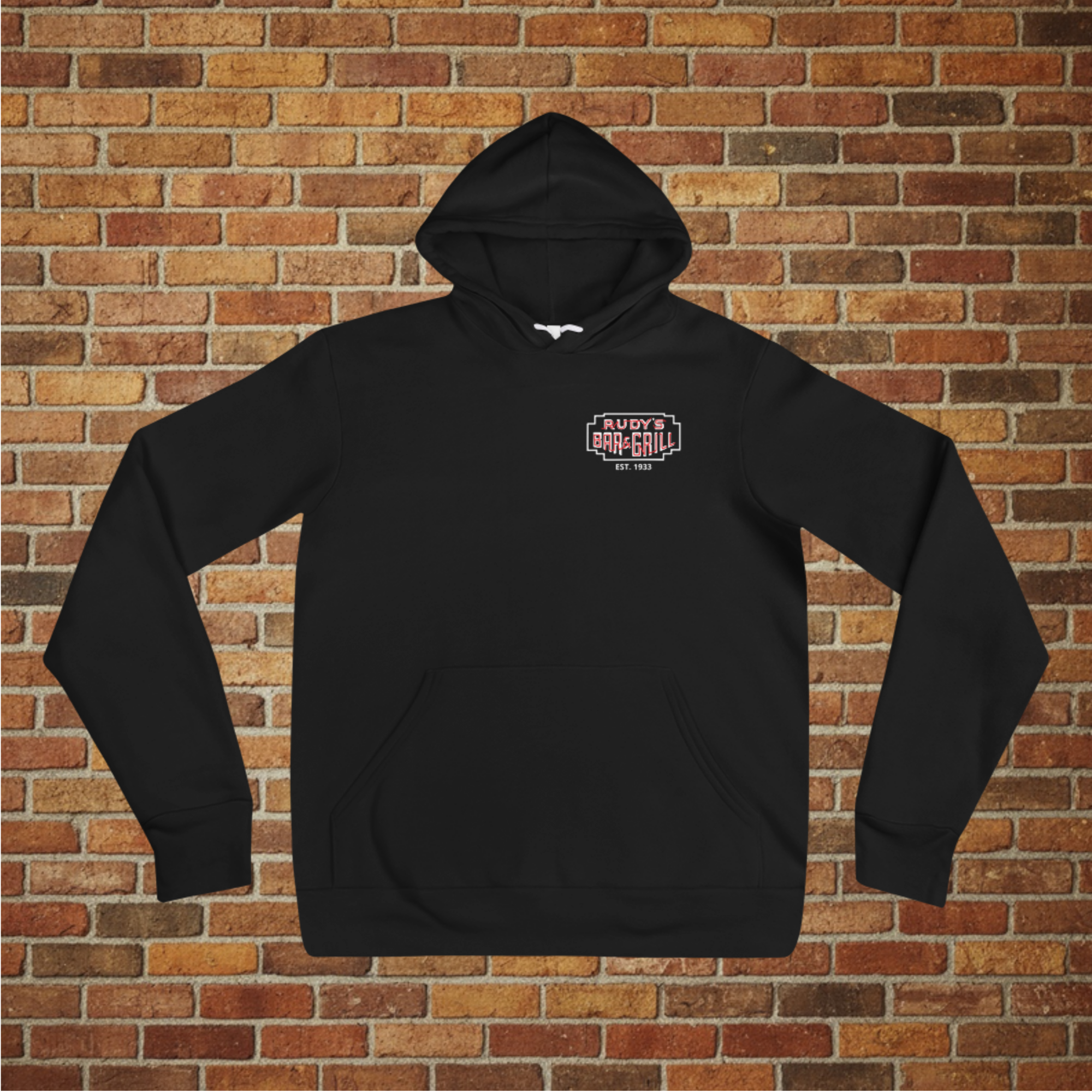 Flat lay of black hoodie with Rudy’s Bar & Grill logo on chest, displayed against brick wall background