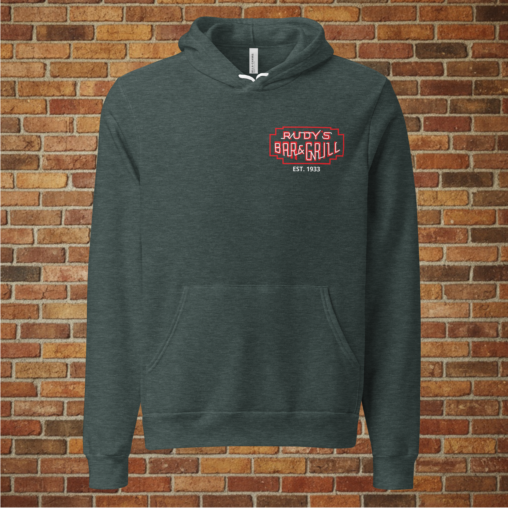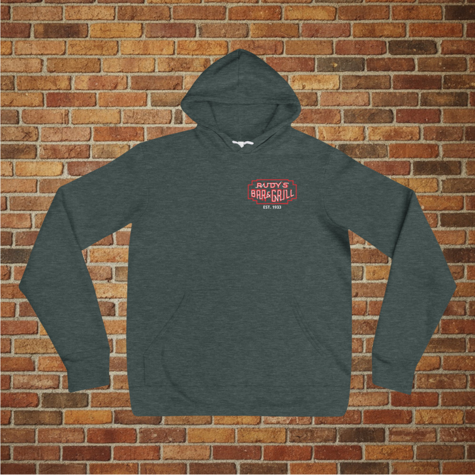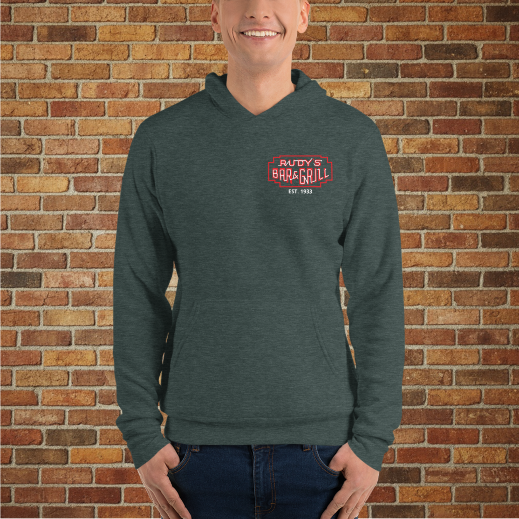 The Rudy's Bar & Grill Saxophone Pig Unisex Hoodie is perfect for those that love Jazz and dives bars. The Hoodie features our famous pig mascot Baron Von Swine playing a saxophone and our Historic Neon Sign dating back to 1933 that hangs outside the bar location in Hell's Kitchen, New York City. A soft and comfy fleece fabric makes it a great partner all year round, be it a Fall evening outdoor Jazz event, or a chilly night drinking your favorite beer or cocktail.