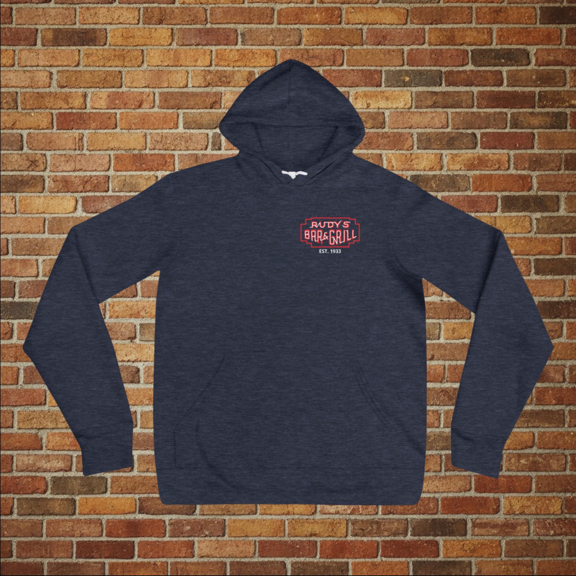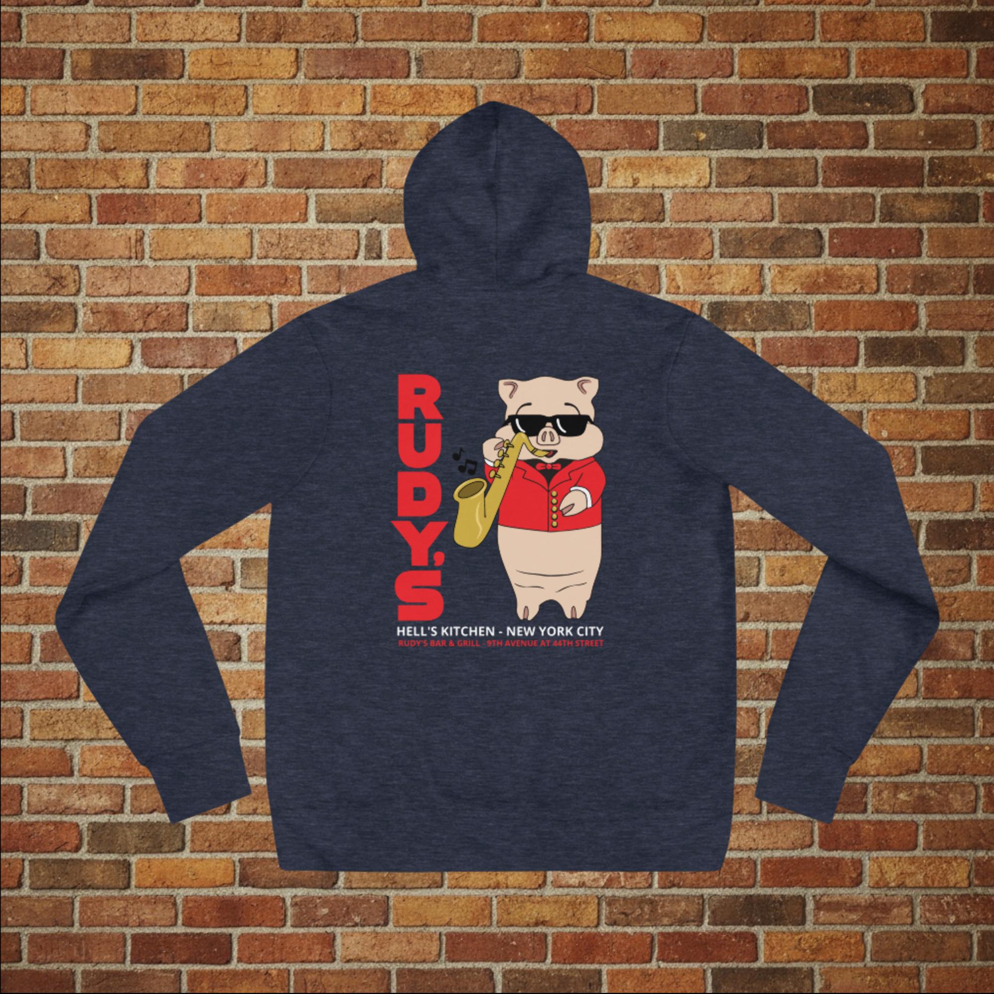 The Rudy's Bar & Grill Saxophone Pig Unisex Hoodie is perfect for those that love Jazz and dives bars. The Hoodie features our famous pig mascot Baron Von Swine playing a saxophone and our Historic Neon Sign dating back to 1933 that hangs outside the bar location in Hell's Kitchen, New York City. A soft and comfy fleece fabric makes it a great partner all year round, be it a Fall evening outdoor Jazz event, or a chilly night drinking your favorite beer or cocktail.