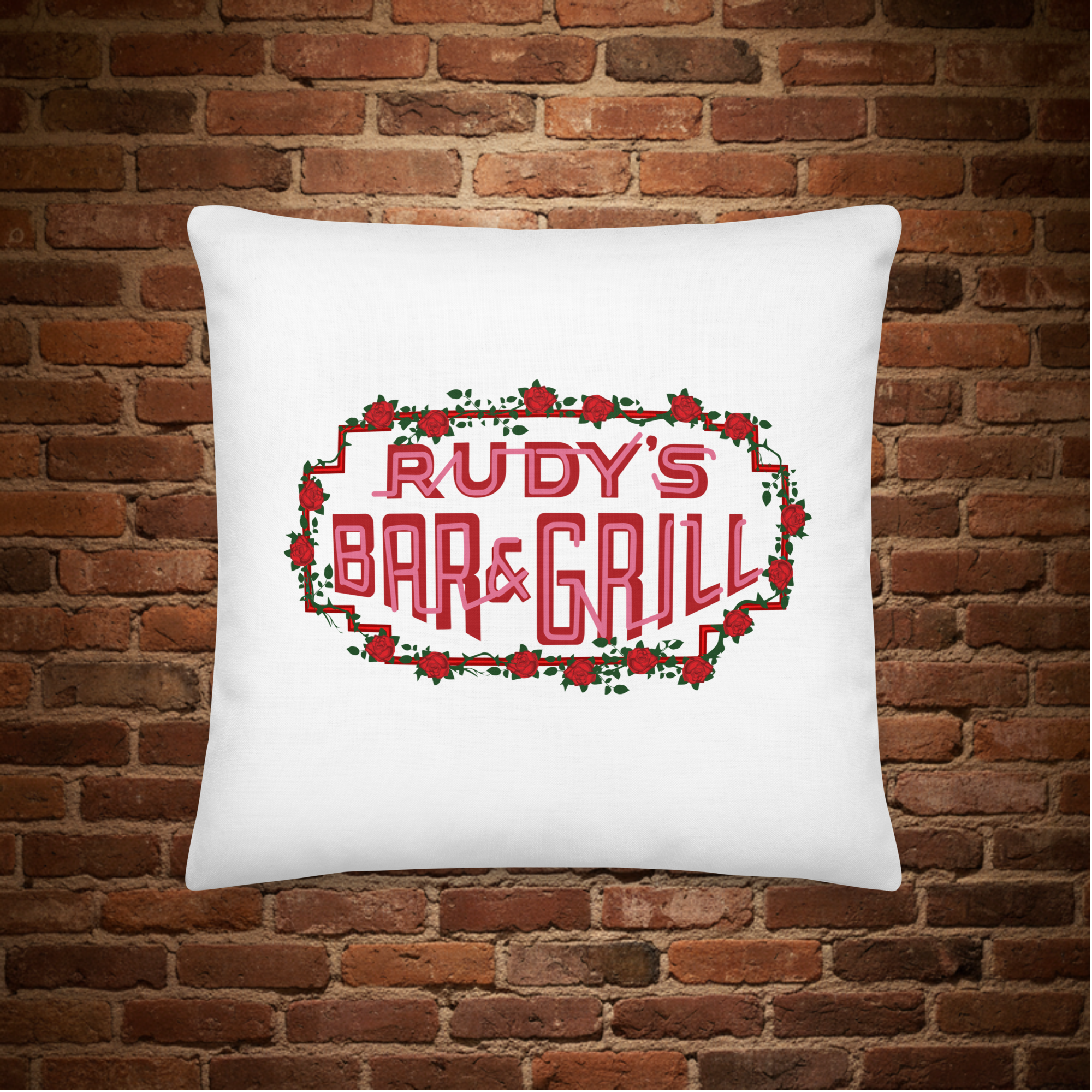 Rudy’s Bar & Grill Valentine’s Day pillow front – red rose border logo on white pillow, brick wall background