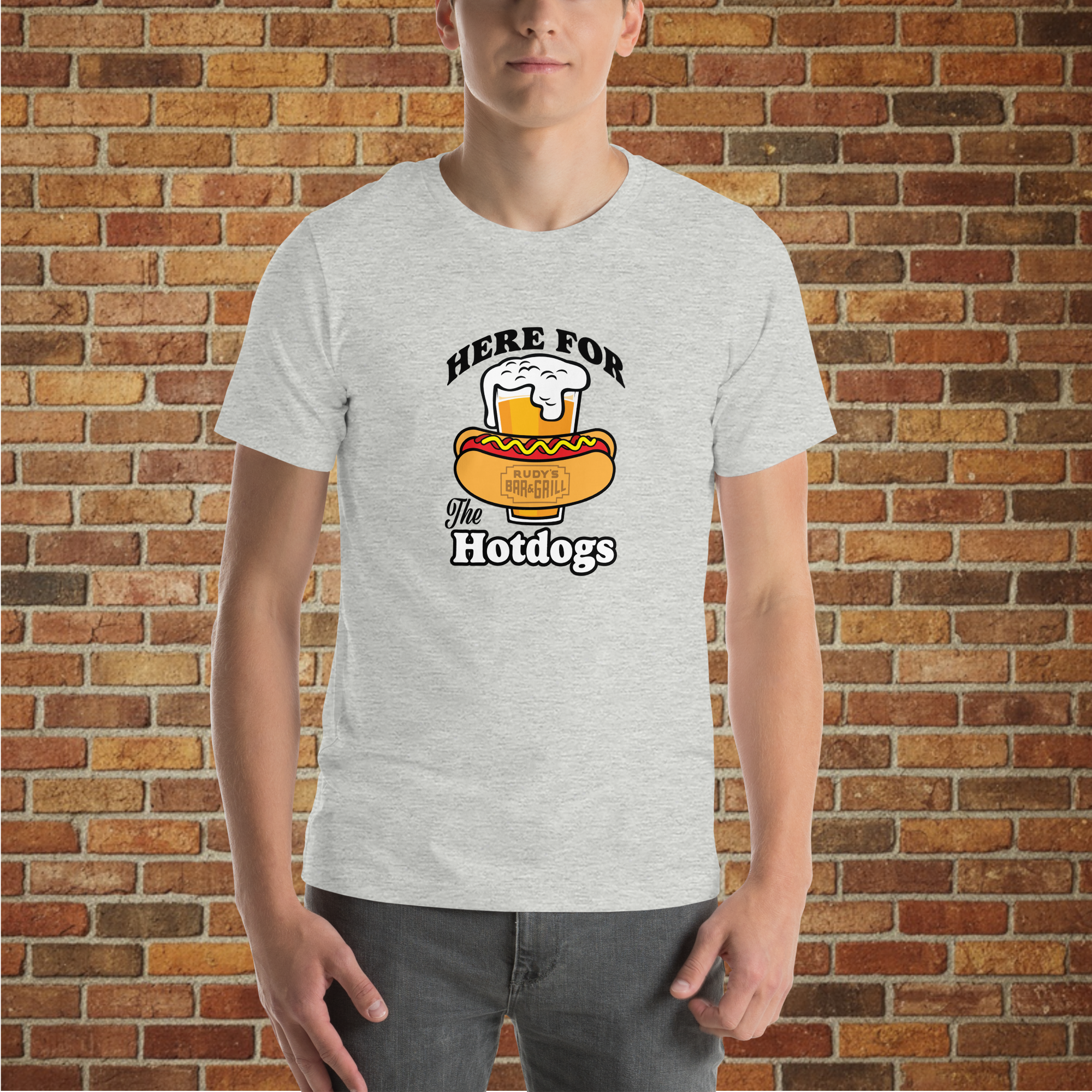Athletic heather "Here for the Hot Dogs" T-shirt from Rudy’s Bar & Grill, displayed flat in front of a brick wall background