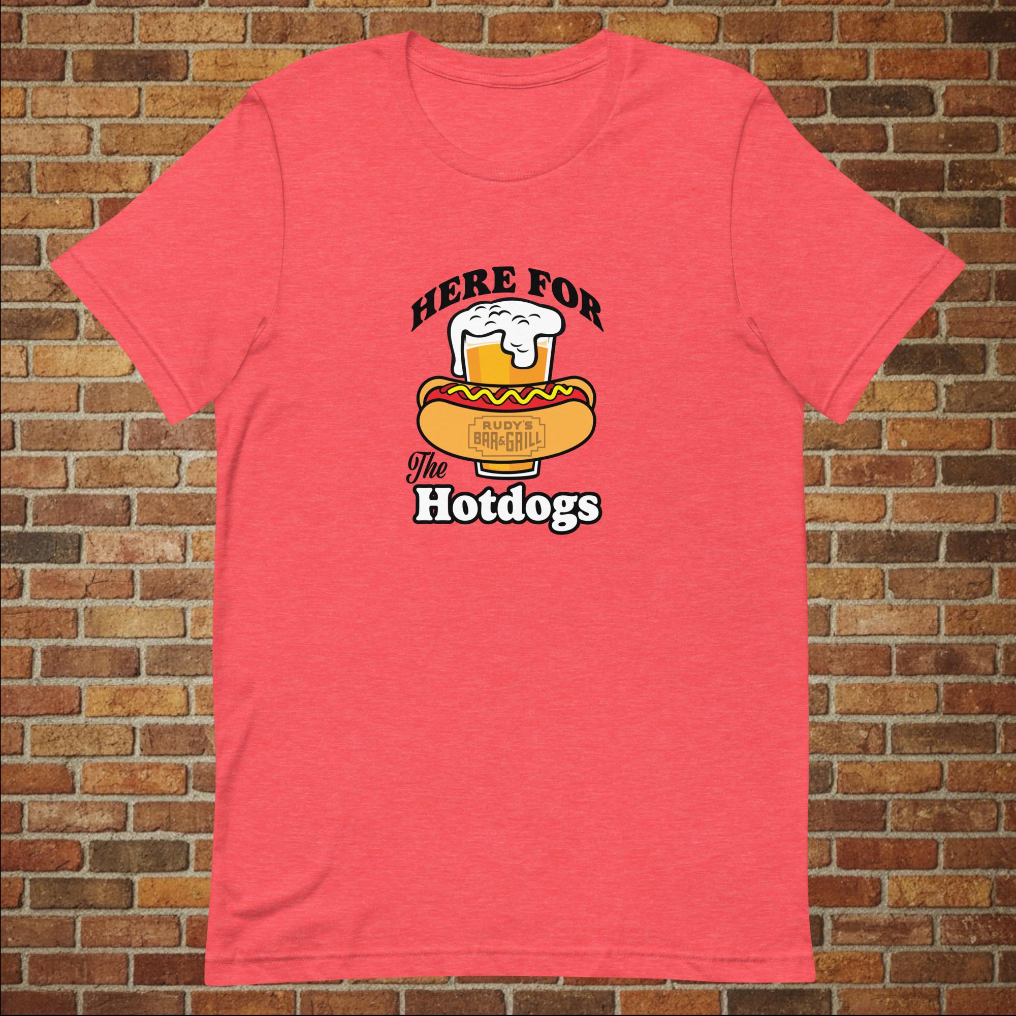 Heather red "Here for the Hot Dogs" T-shirt from Rudy’s Bar & Grill, displayed flat in front of a brick wall background