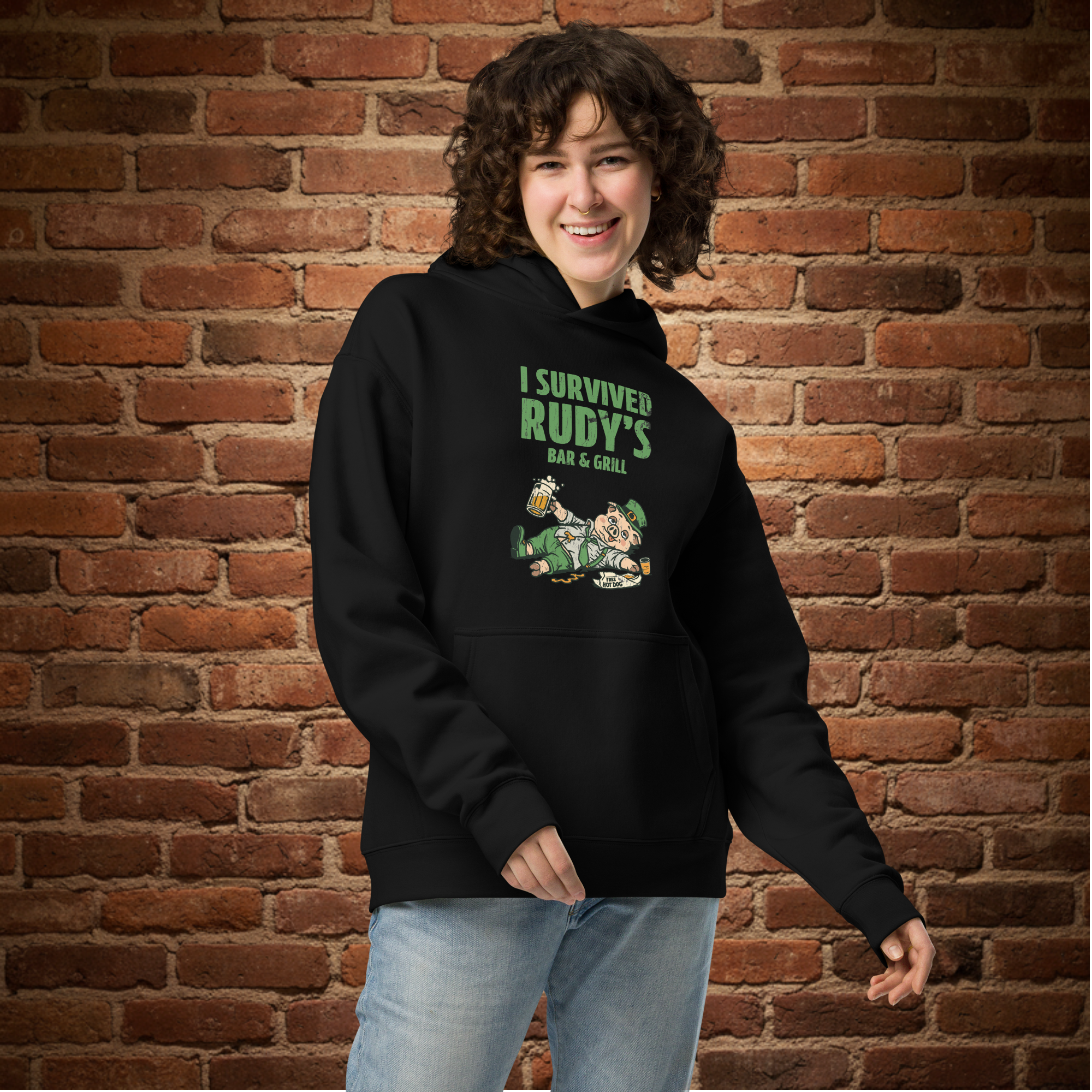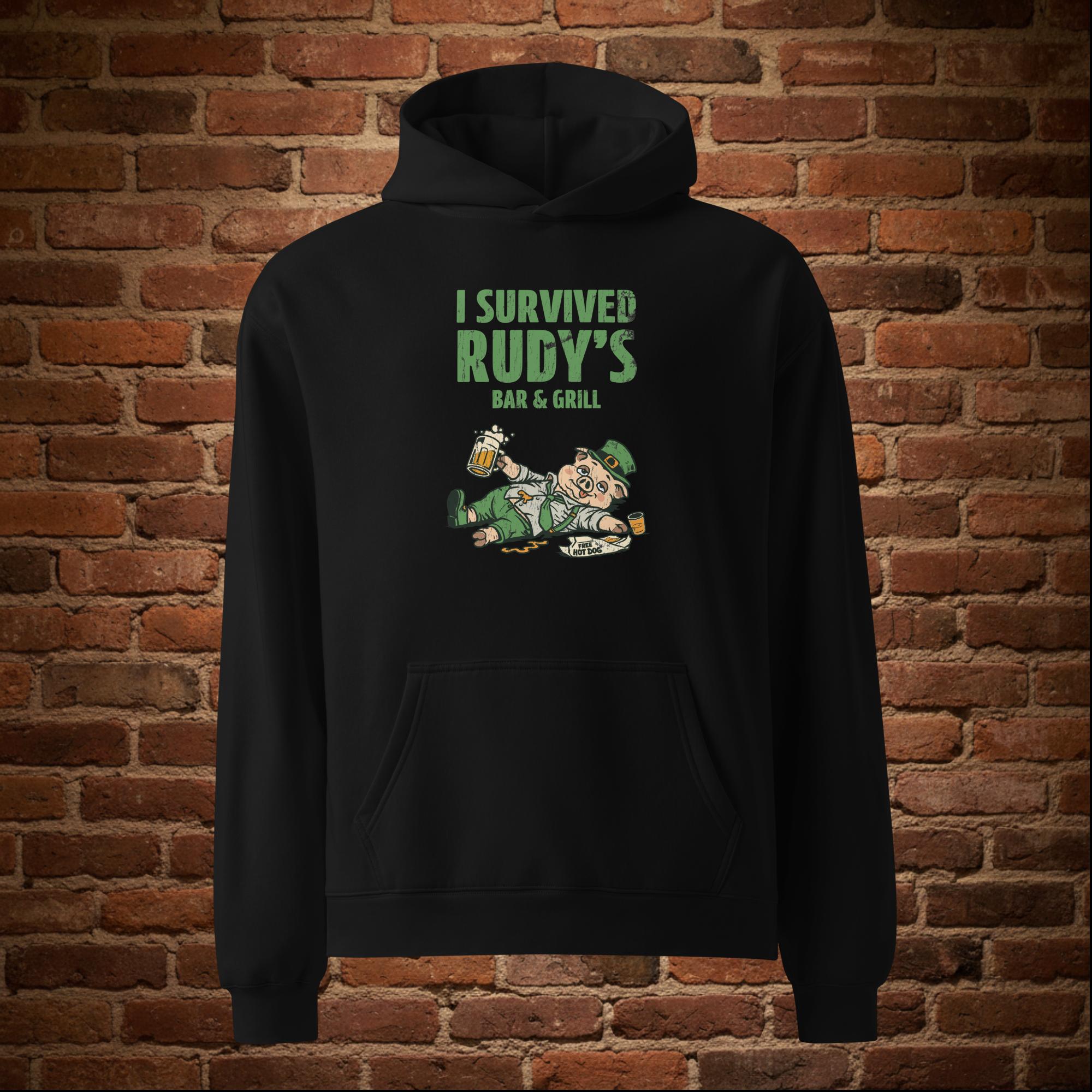 The official Rudy’s St. Paddy’s “I Survived” hoodie features our NYC-bar-level leprechaun Baron mid-recovery beer still in hand, hot dog sacrificed.
