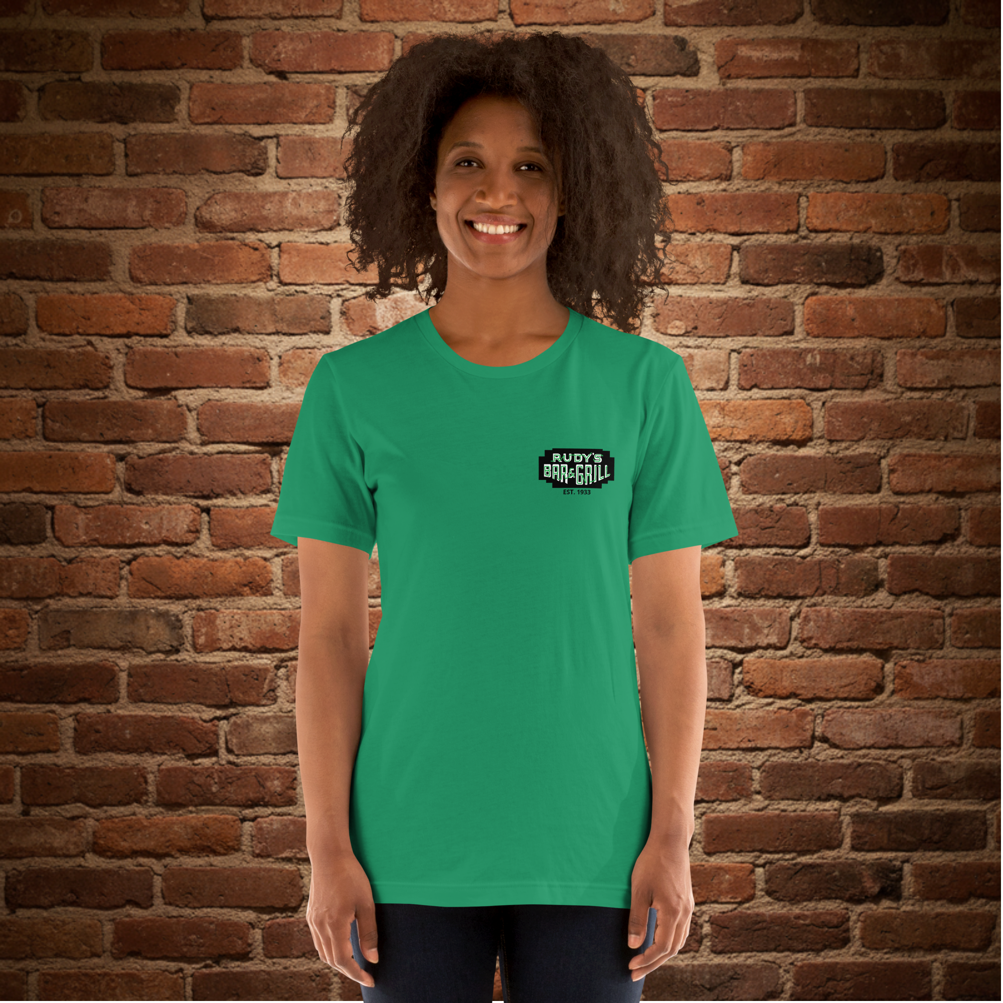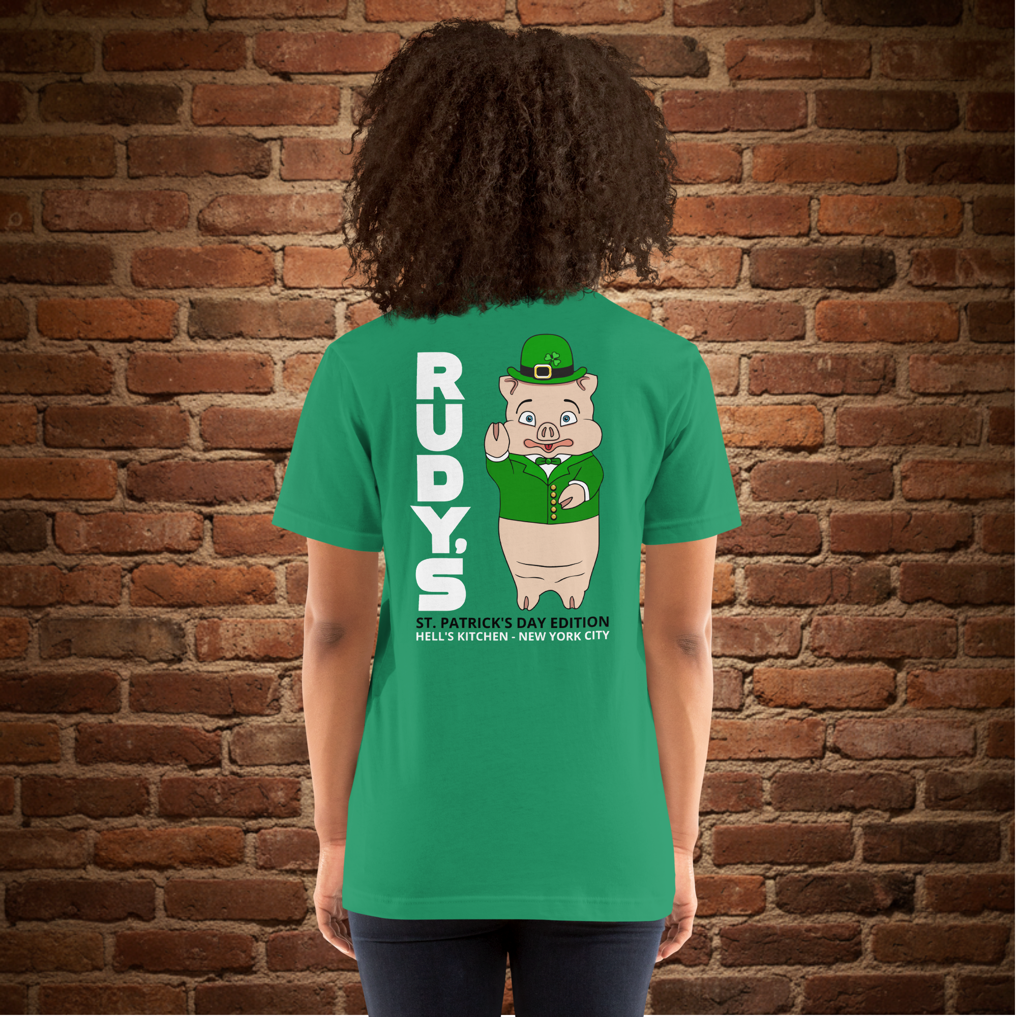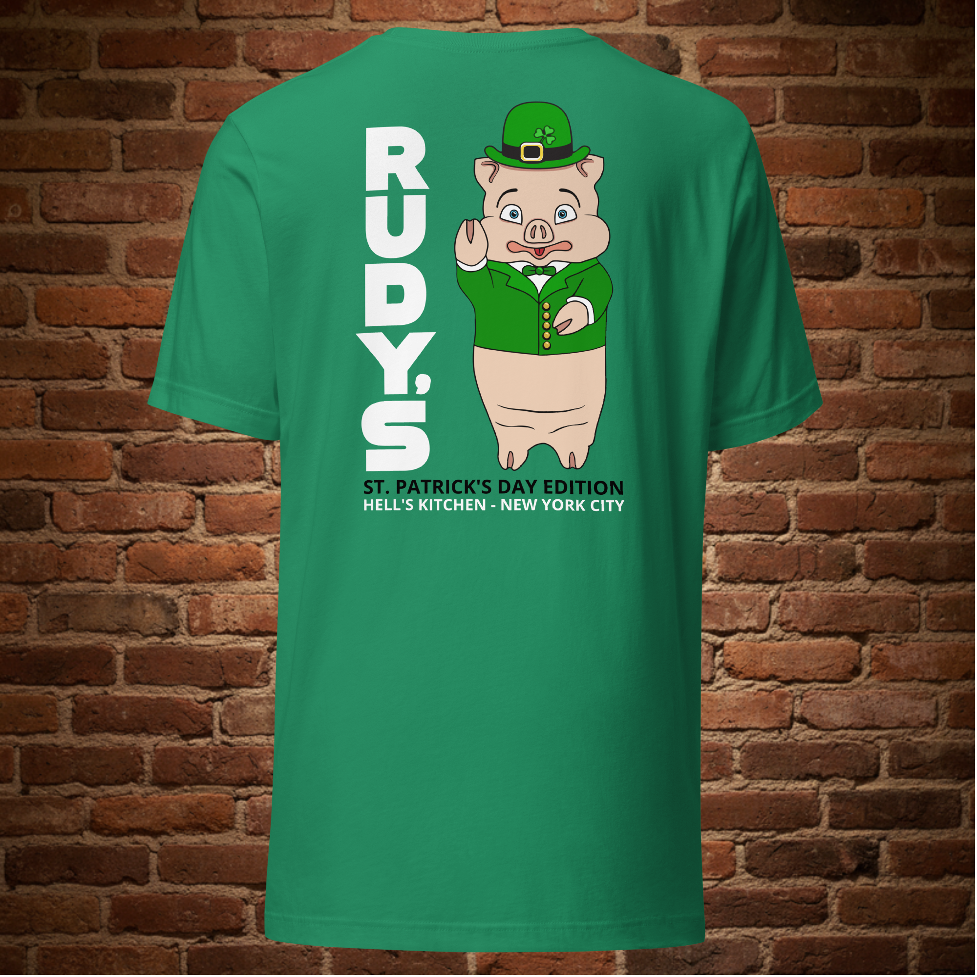 Celebrate St. Patrick’s Day the Rudy’s way. This classic Rudy’s Bar & Grill tee features Baron Von Swine in green plus a St. Patrick’s Day twist on our iconic neon sign from Hell’s Kitchen, NYC. It’s soft, lightweight, and built for long nights and loud stories.