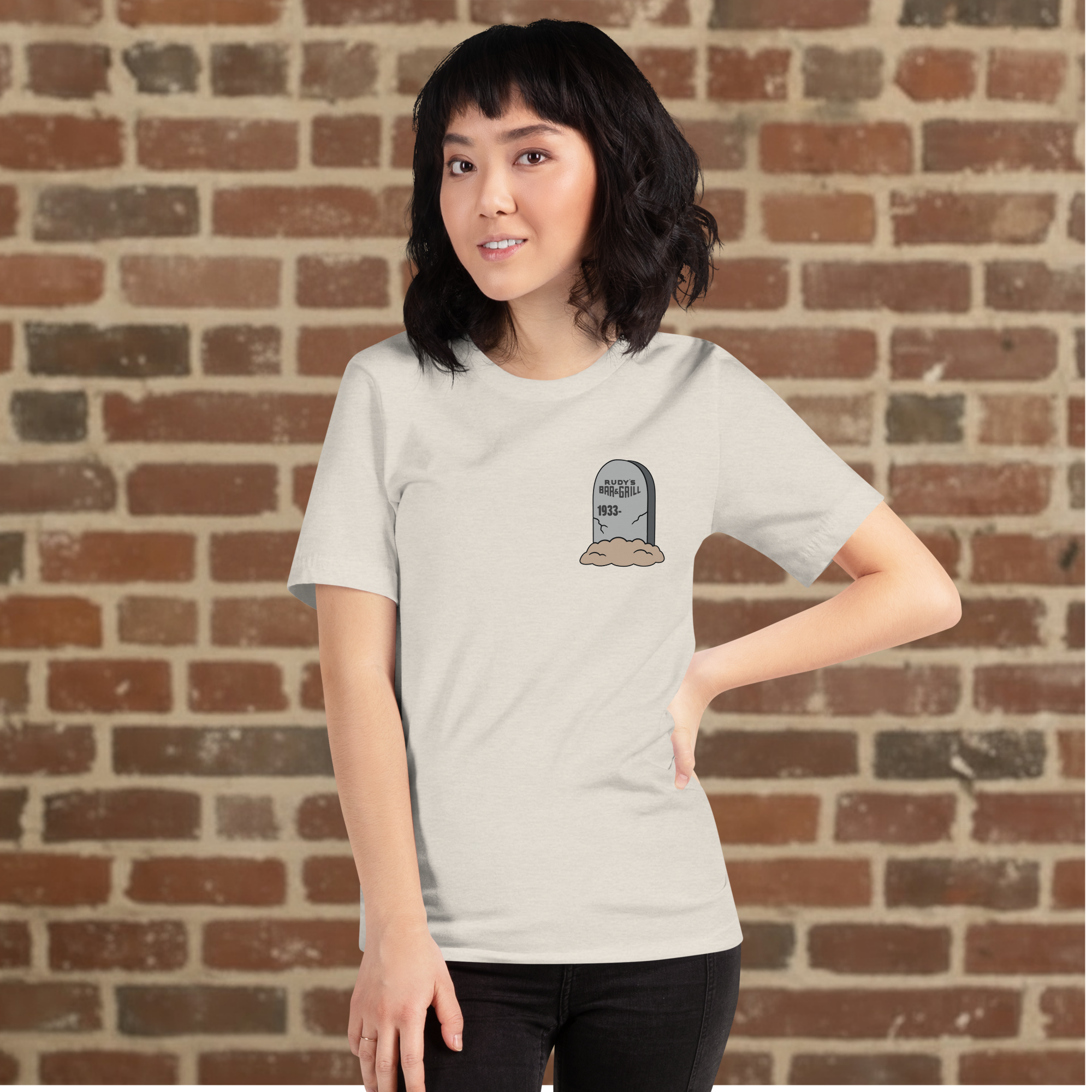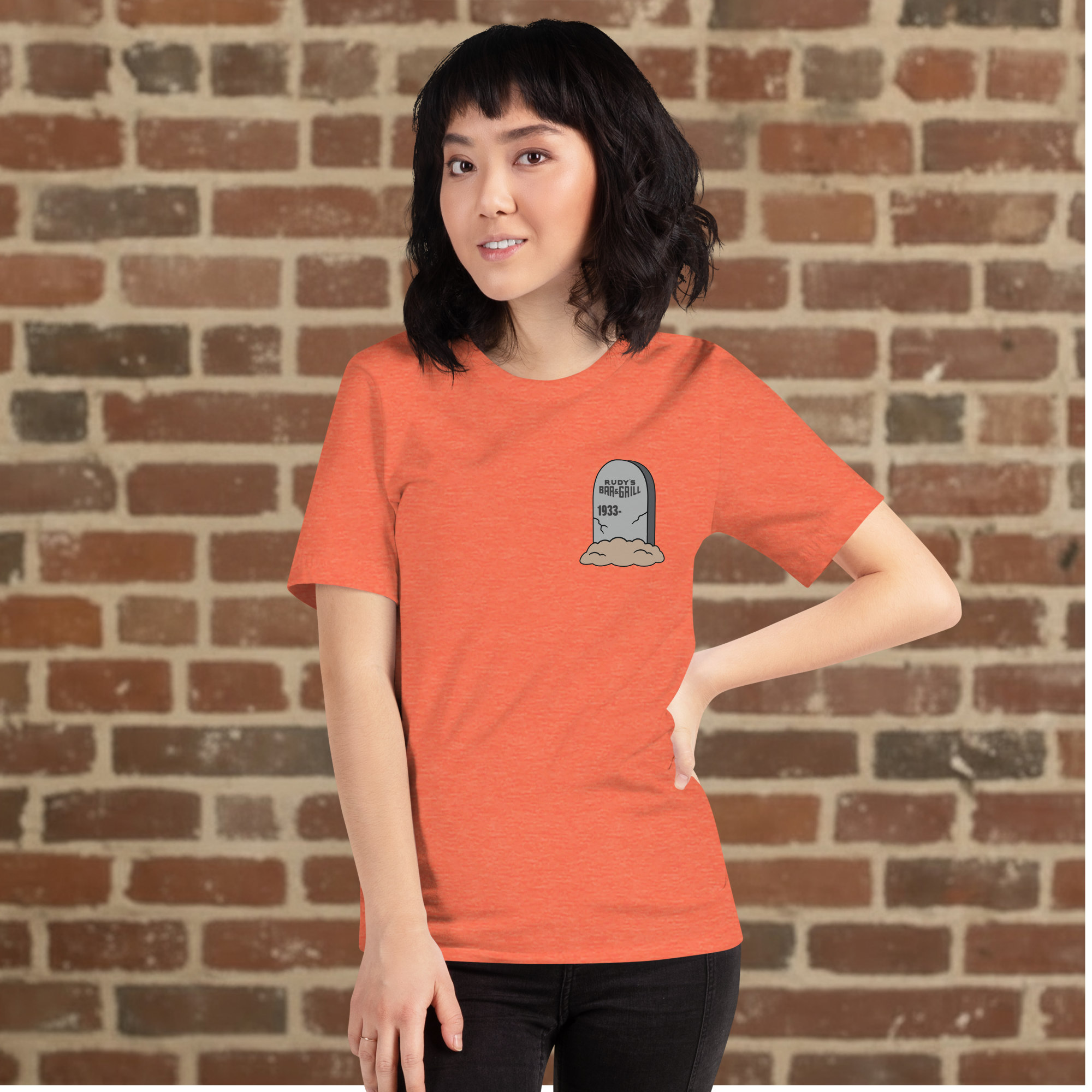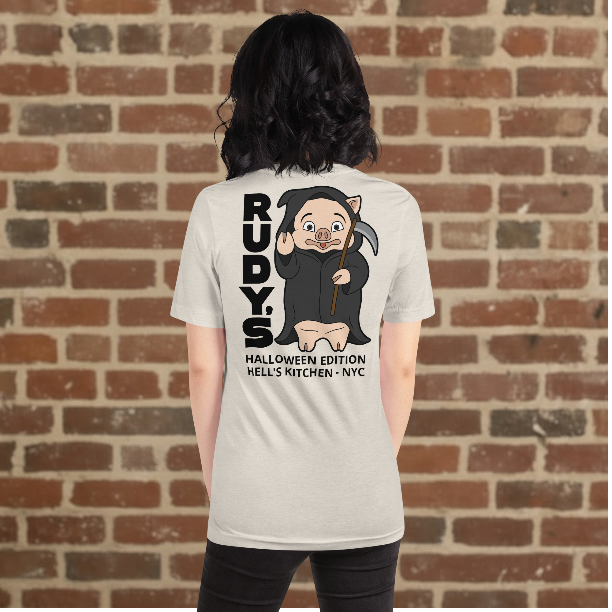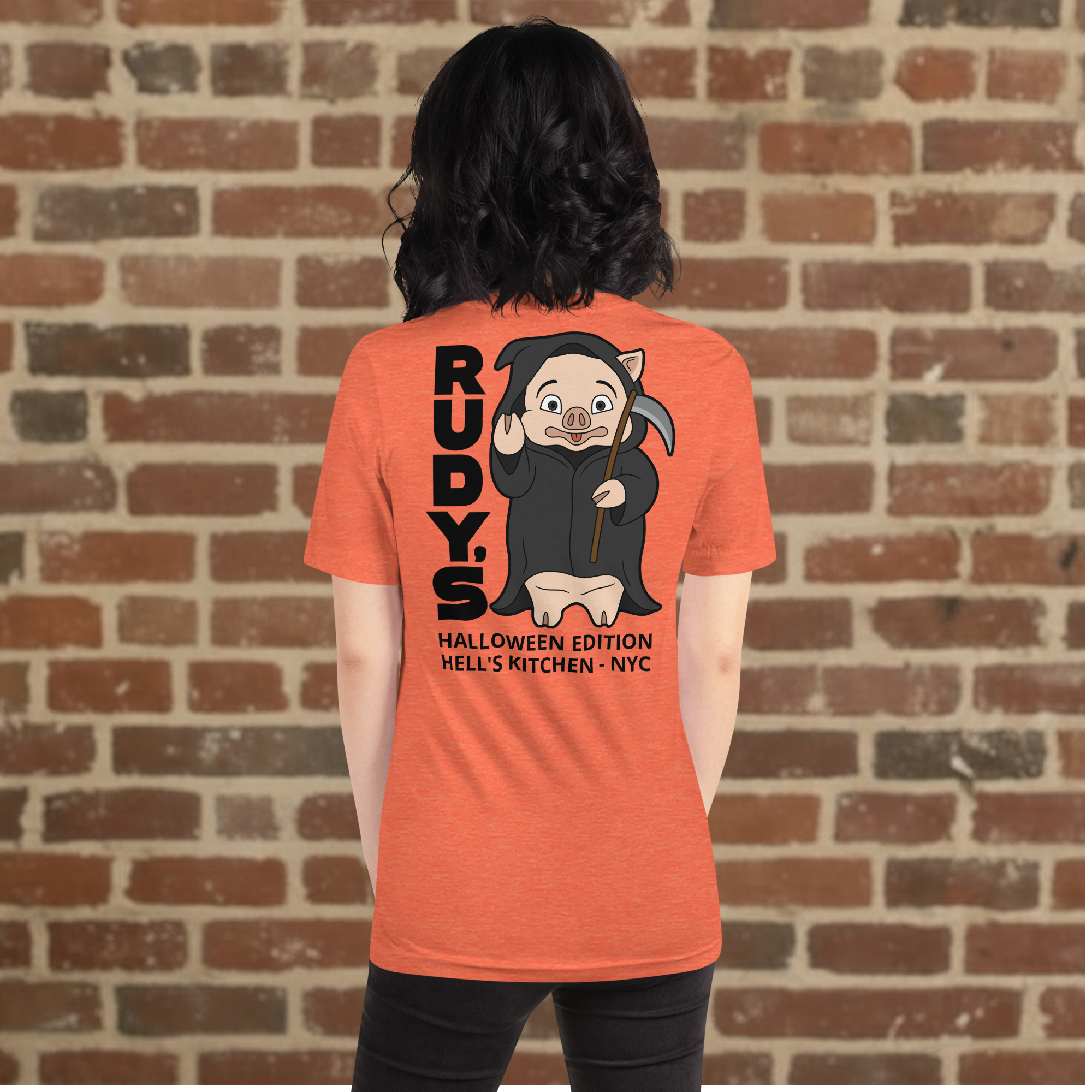 Celebrate Halloween in classic NYC style with Rudy’s Bar & Grill’s limited-edition Grim Pig t-shirt! Featuring our iconic Baron Von Swine dressed as the Grim Reaper and a custom tombstone front graphic, this ultra-soft unisex tee is perfect for fans and Hell’s Kitchen locals alike. Whether you’re grabbing a $4 beer or repping your favorite bar around town, this shirt brings the spirit of Rudy’s to every season. Available in heather orange and heather dust. Get yours before they’re gone!